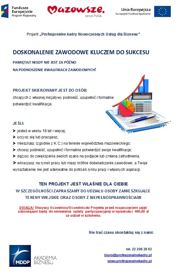 informacja o projekcie realizowanym z Europejskiego Funduszu Społecznego pt. „Profesjonalne kadry Nowoczesnych Usług dla Biznesu”