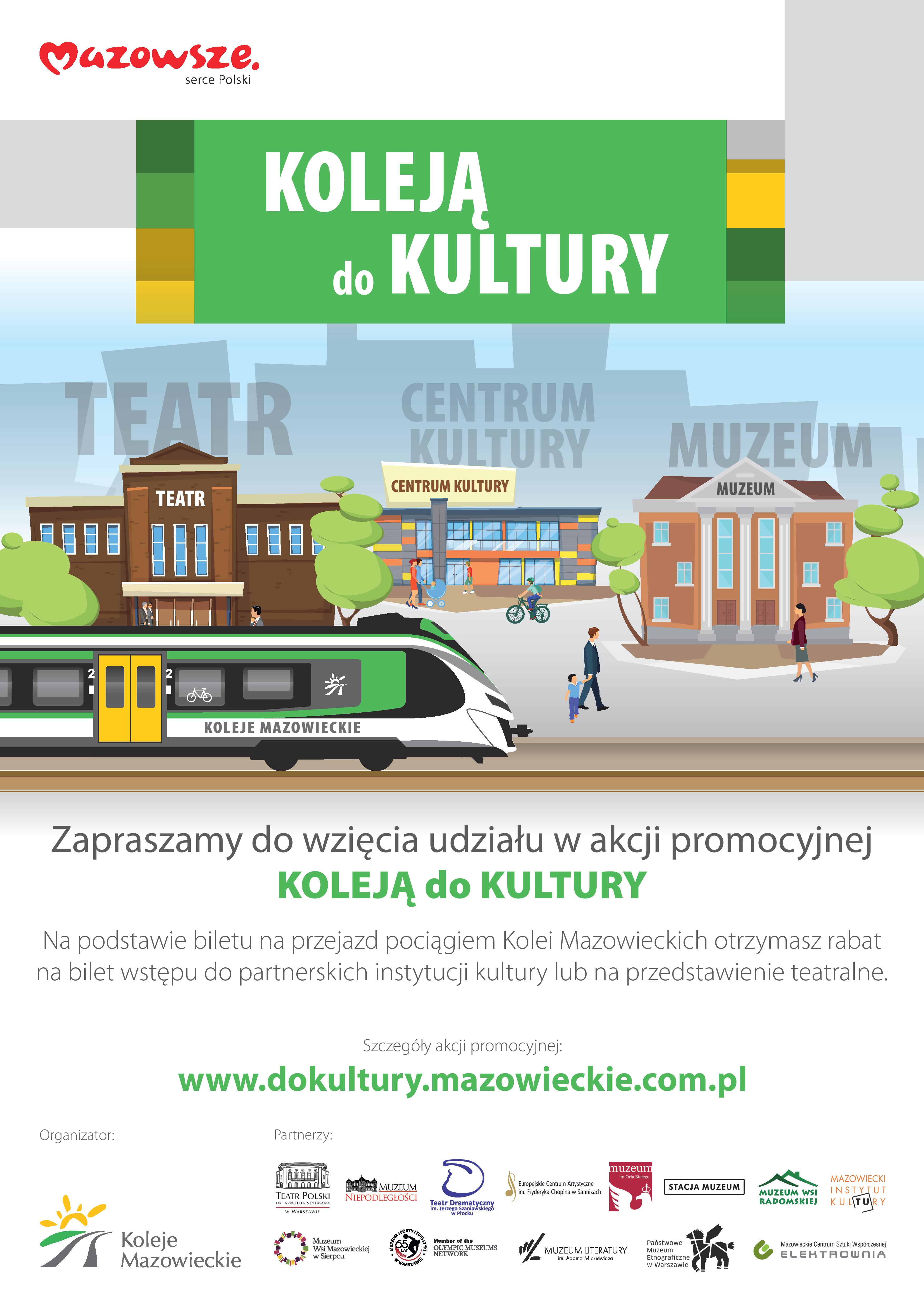 Zachęcam do wzięcia udziały w akcji promocyjnej „Koleją do Kultury”. Na podstawie biletu na przejazd pociągiem Kolei Mazowieckich można uzyskać wysokie rabaty w jednej z partnerskich instytucji kultury: