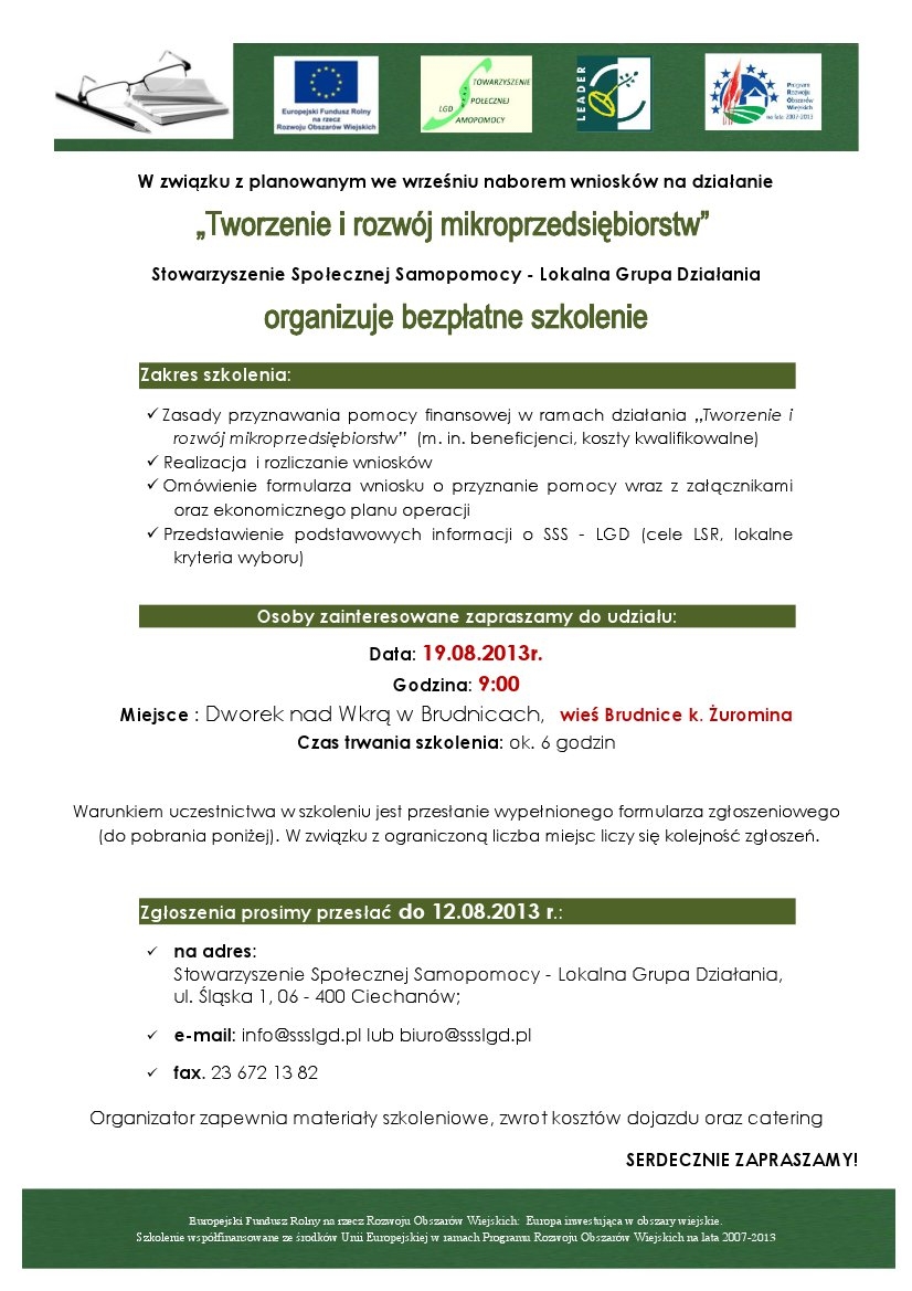 19.08 - szkolenie dla Beneficjentów działąnia ,,Tworzenie i rozwój mikroprzedsiębiorstw" w Brudnicach k.Żuromina (20 osób)